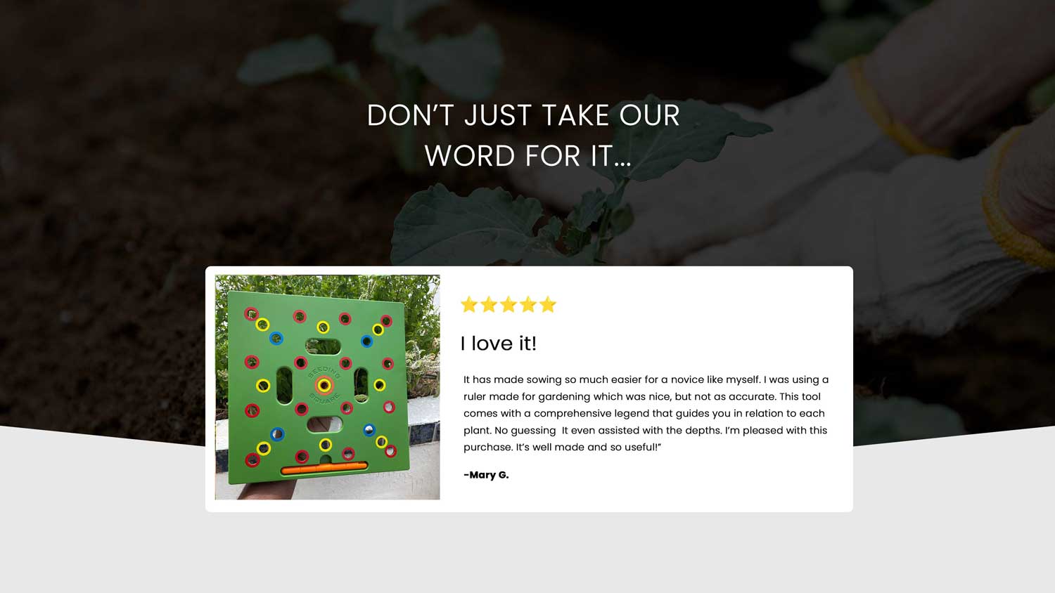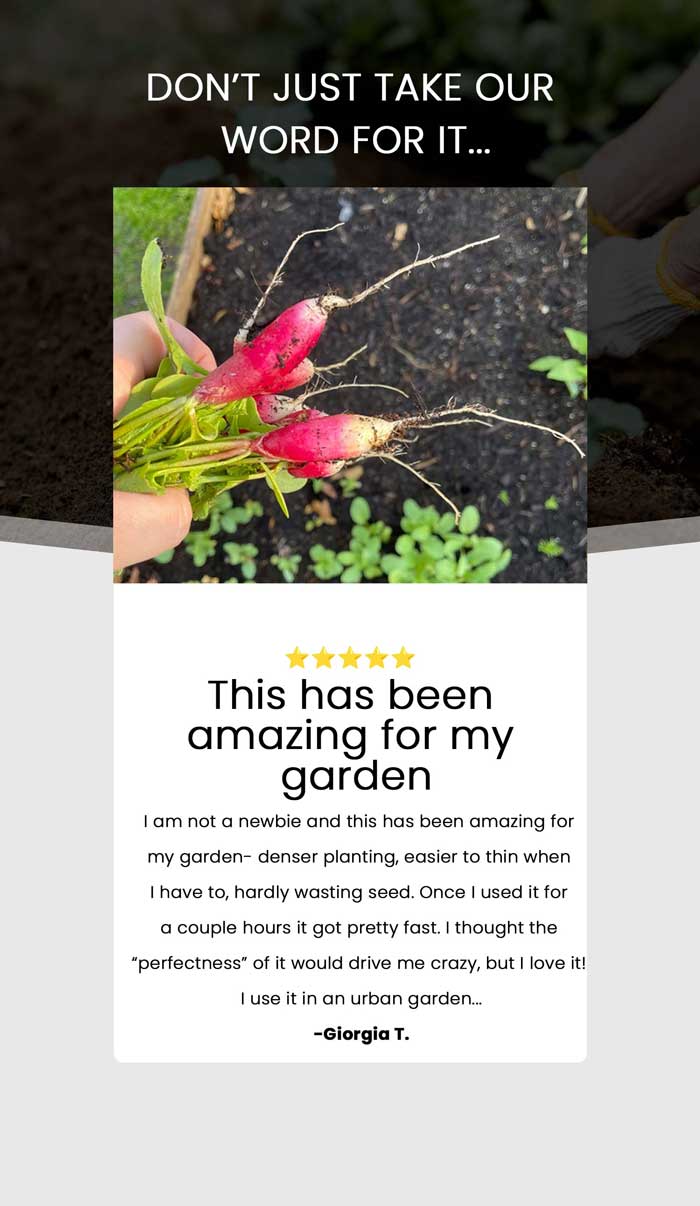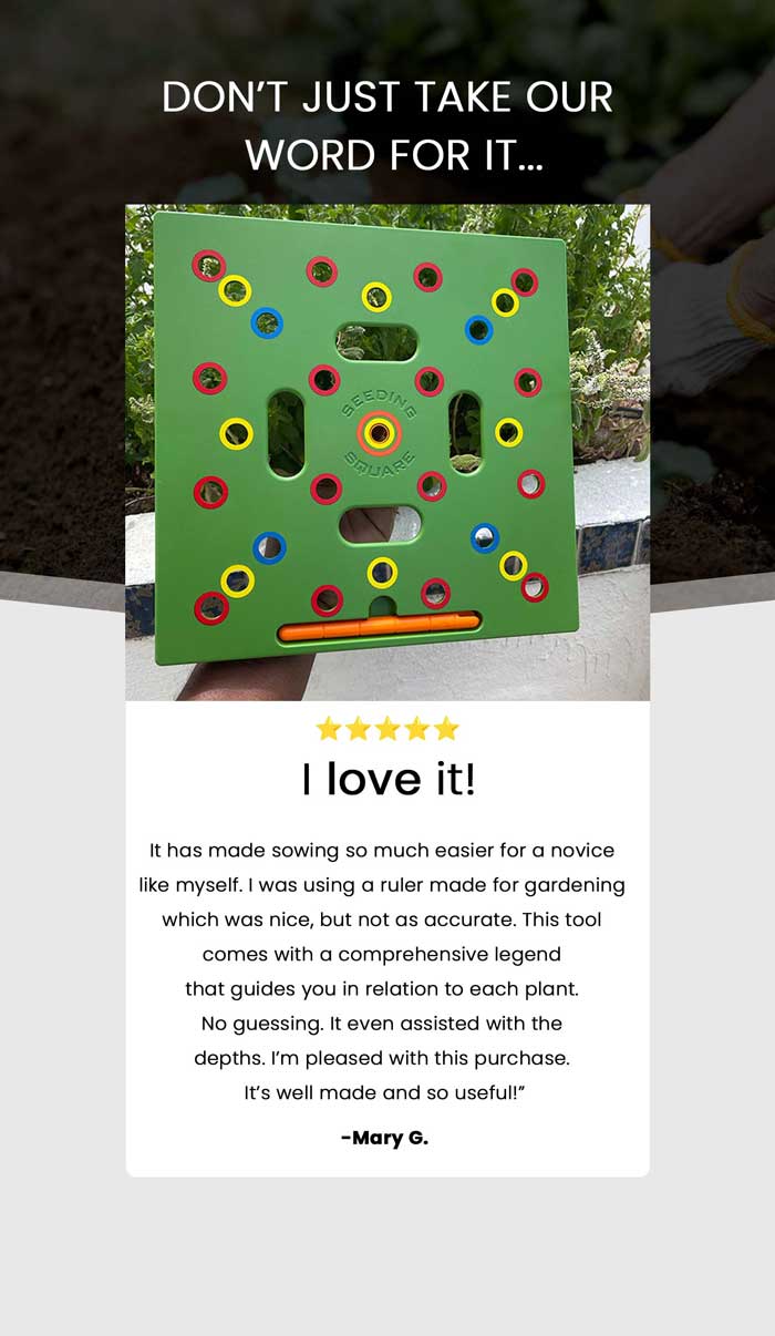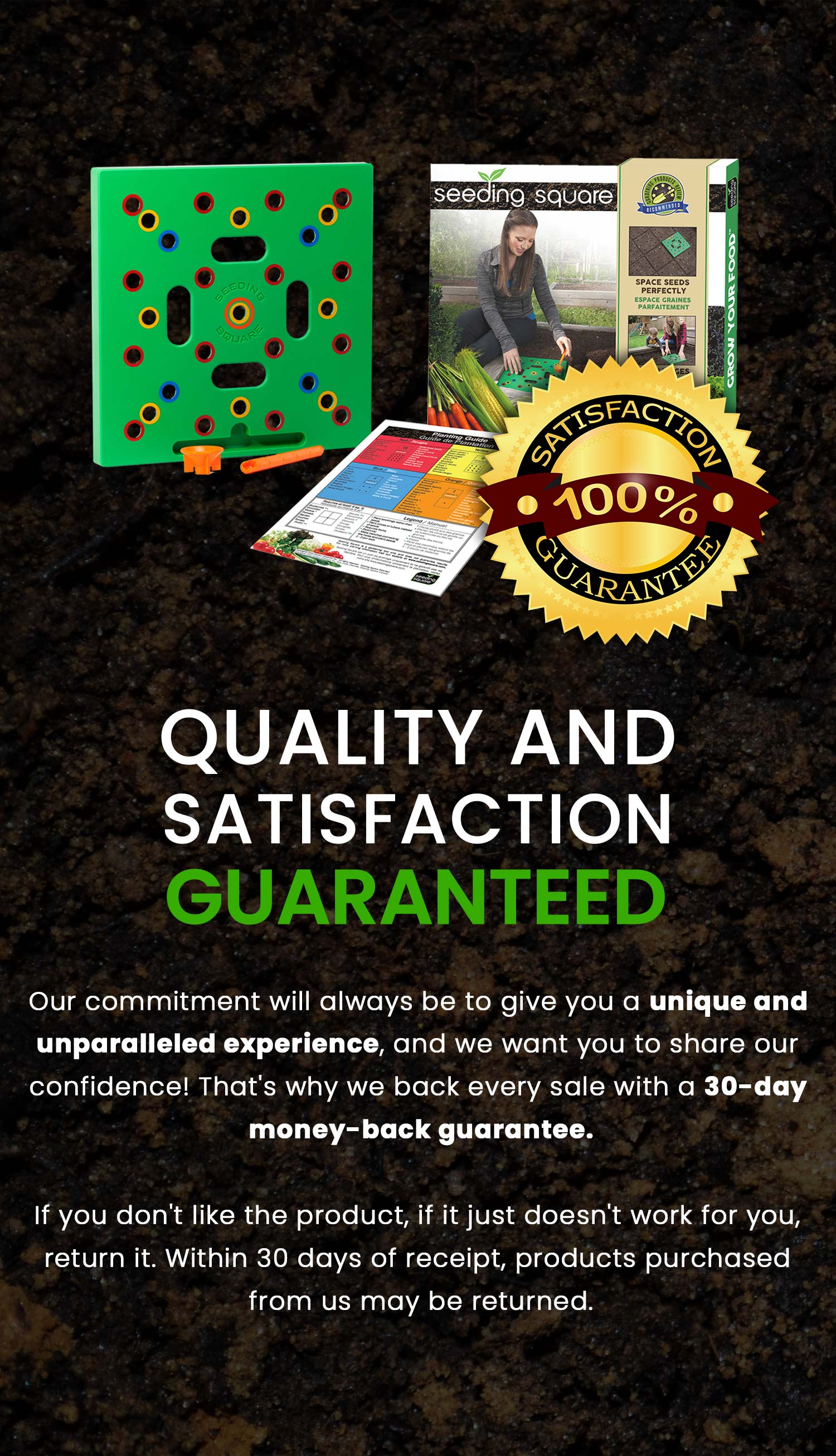 Designed for heavy repeat use, reap the benefits year after year. Seeding Square™ keeps on giving. Made with durable high quality ABS plastic, keep it and pass it on to the next generation of gardeners!